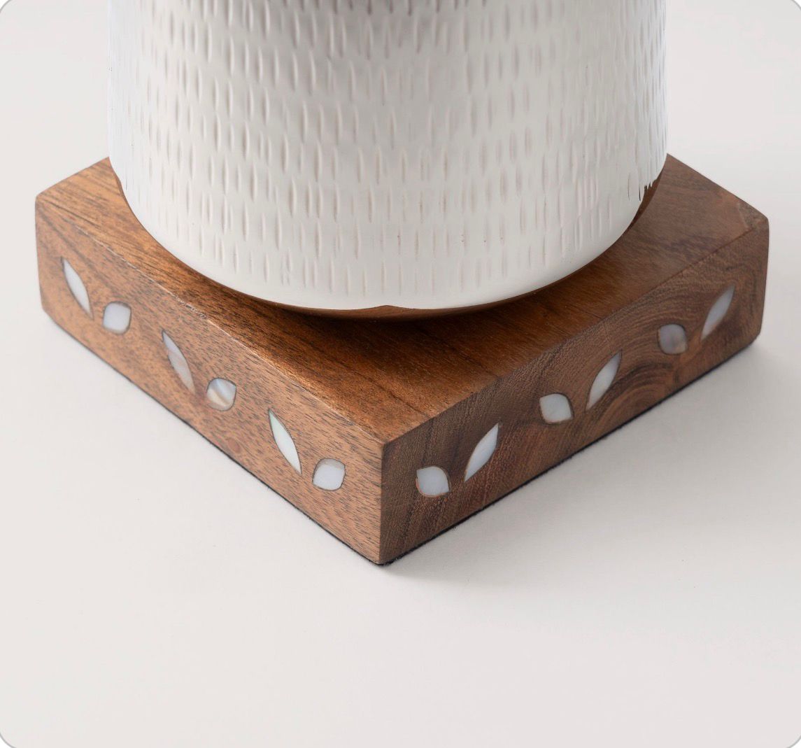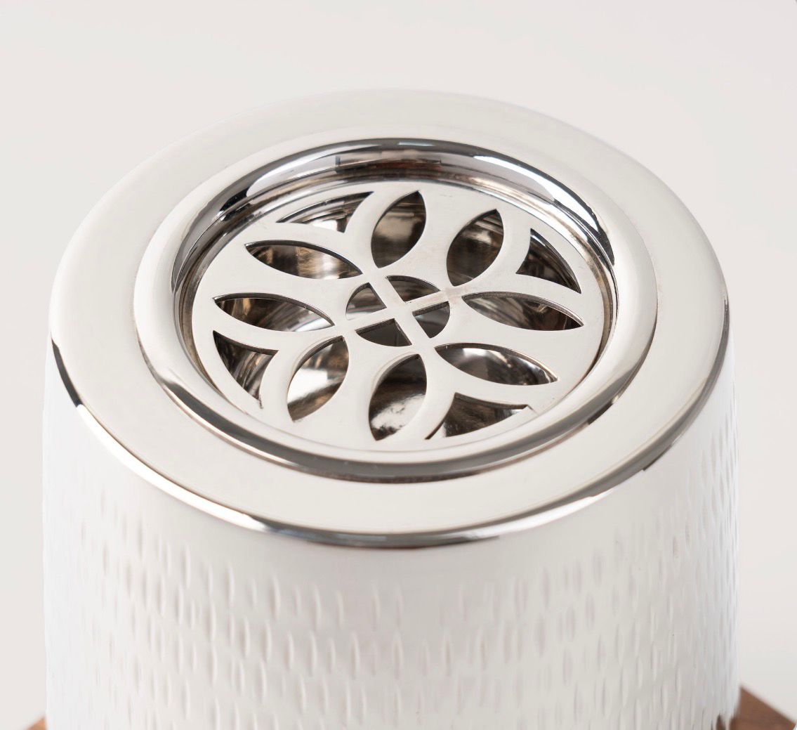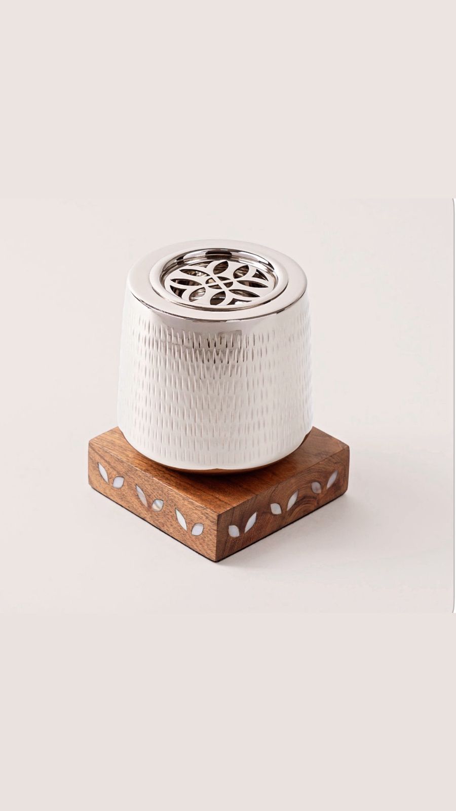 Modern incense burner with a textured white body, metal top, and natural wood base. A stylish piece that adds a calm, elegant touch to any space — perfect for daily use and gatherings.