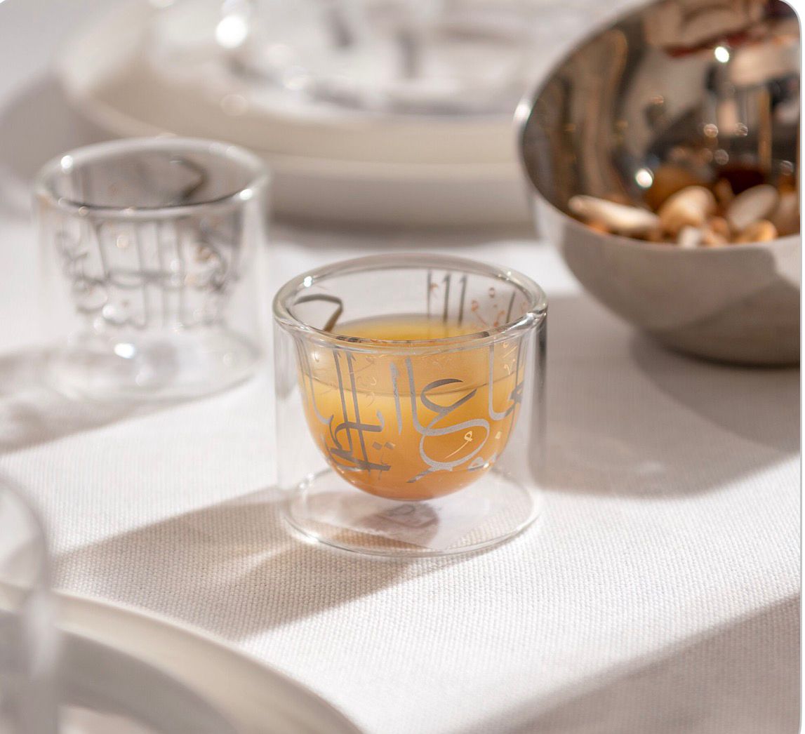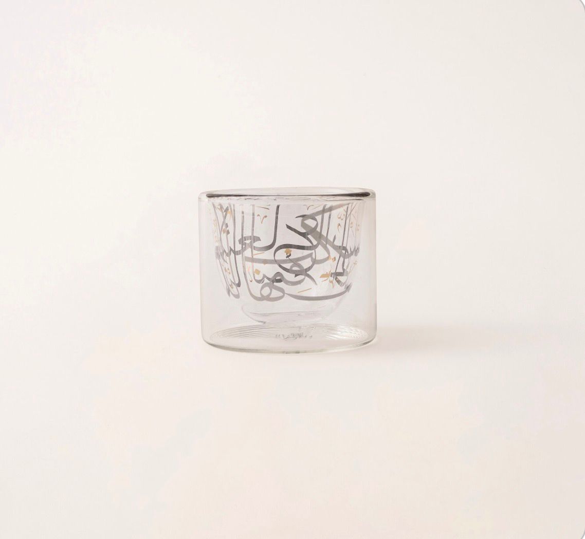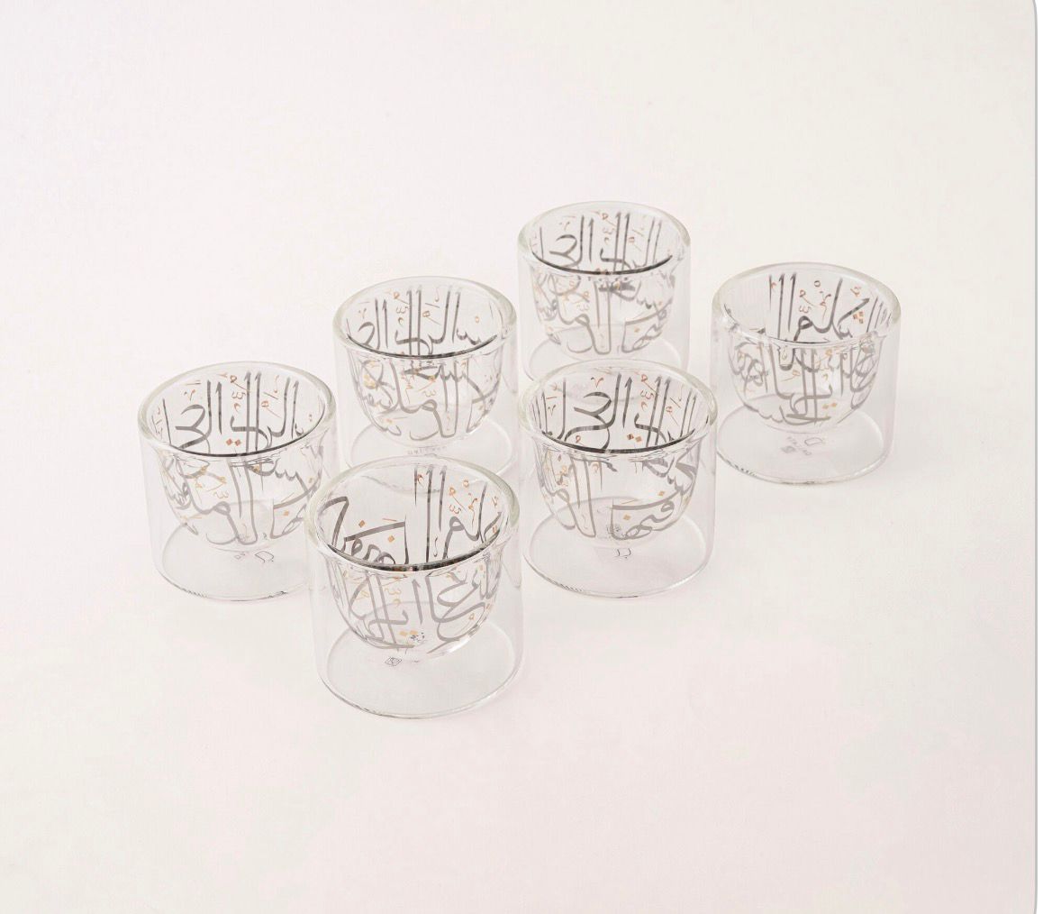 Part of the Taraf Collection, this elegant set of glass coffee cups features a refined Arabic calligraphy print with subtle metallic accents. Designed for stylish coffee serving and modern hospitality, the transparent double-wall look adds a premium touch to your table and makes it perfect for gatherings and gifting.